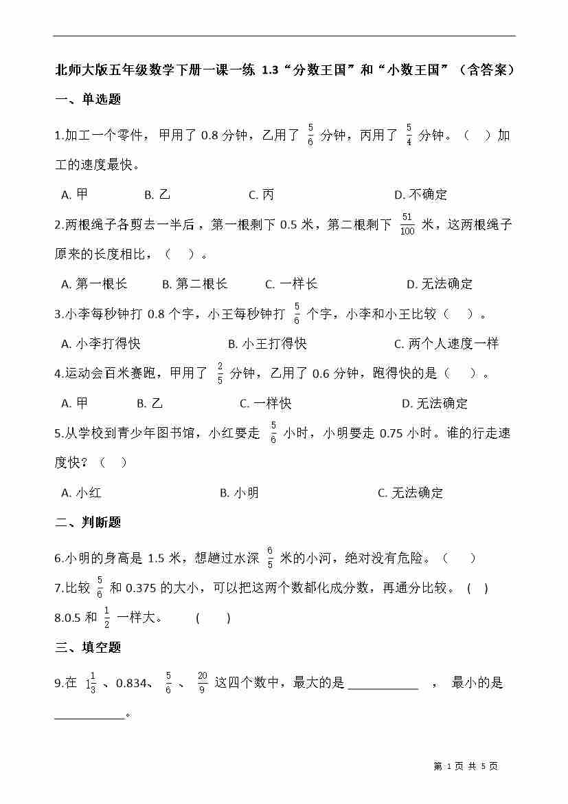 首页 > 全部 > 一课一练 > 1.3“分数王国”和“小数王国” (含答案)