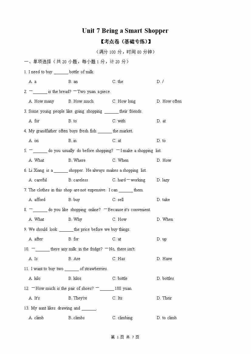 Unit 7 Being a Smart Shopper【考点卷·基础训练】(原卷版)
