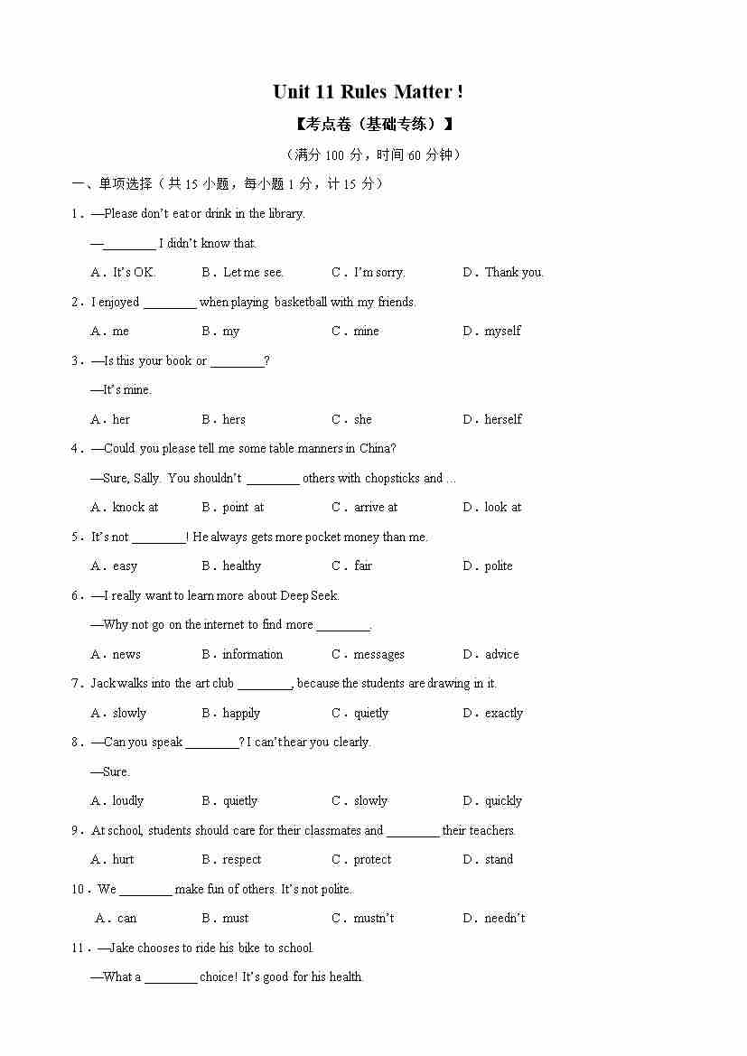 首页 > 全部 > 单元测试 > Unit 11 Rules Matter!【考点卷·基础训练】(原卷版)