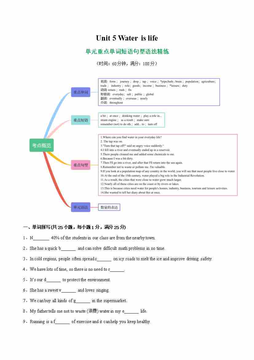 首页 > 全部 > 语法精练 > Unit 5 Water is life【语法精练】(原卷版)