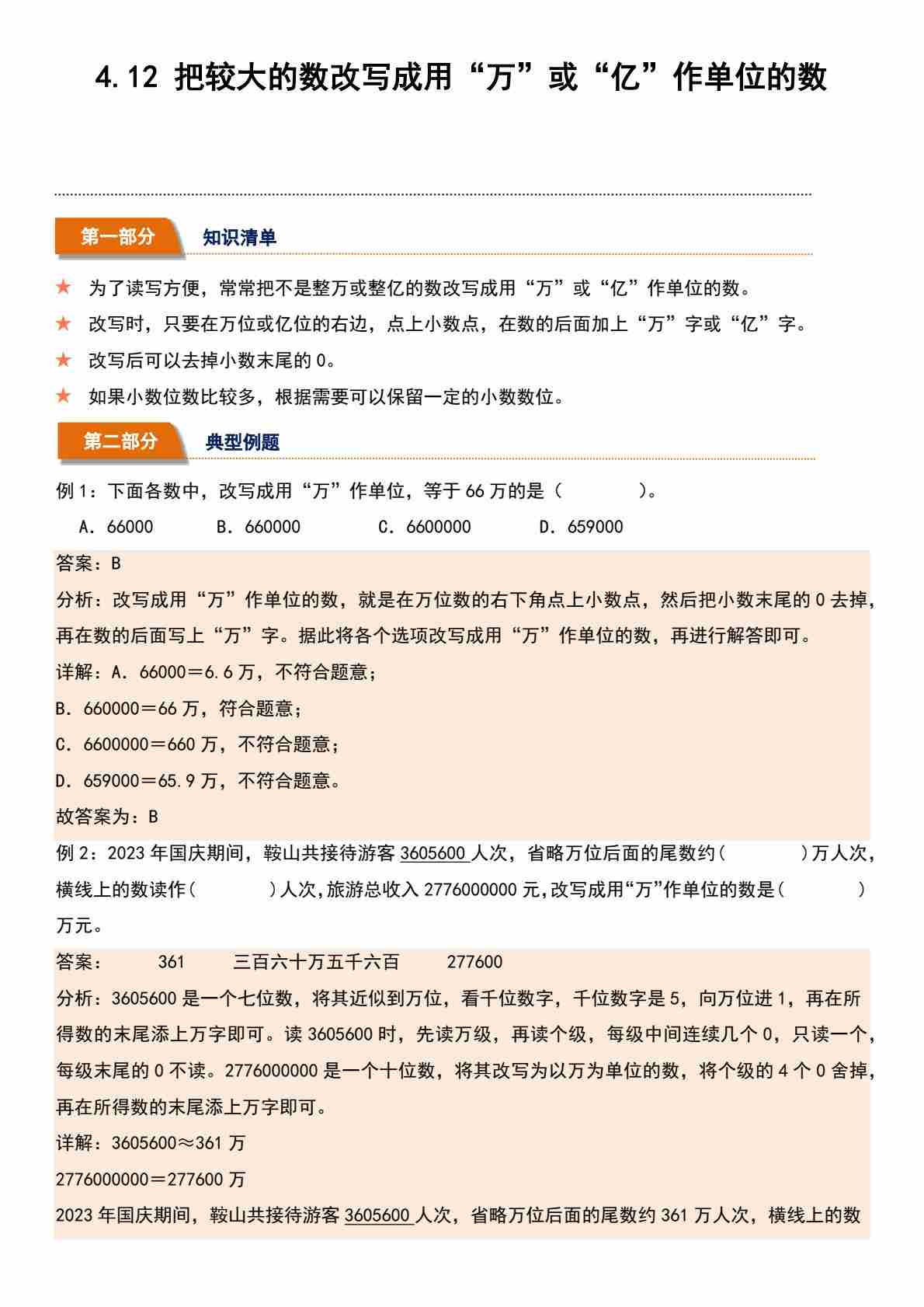4.12 把较大的数改写成用“万”或“亿”作单位的数(分层作业)