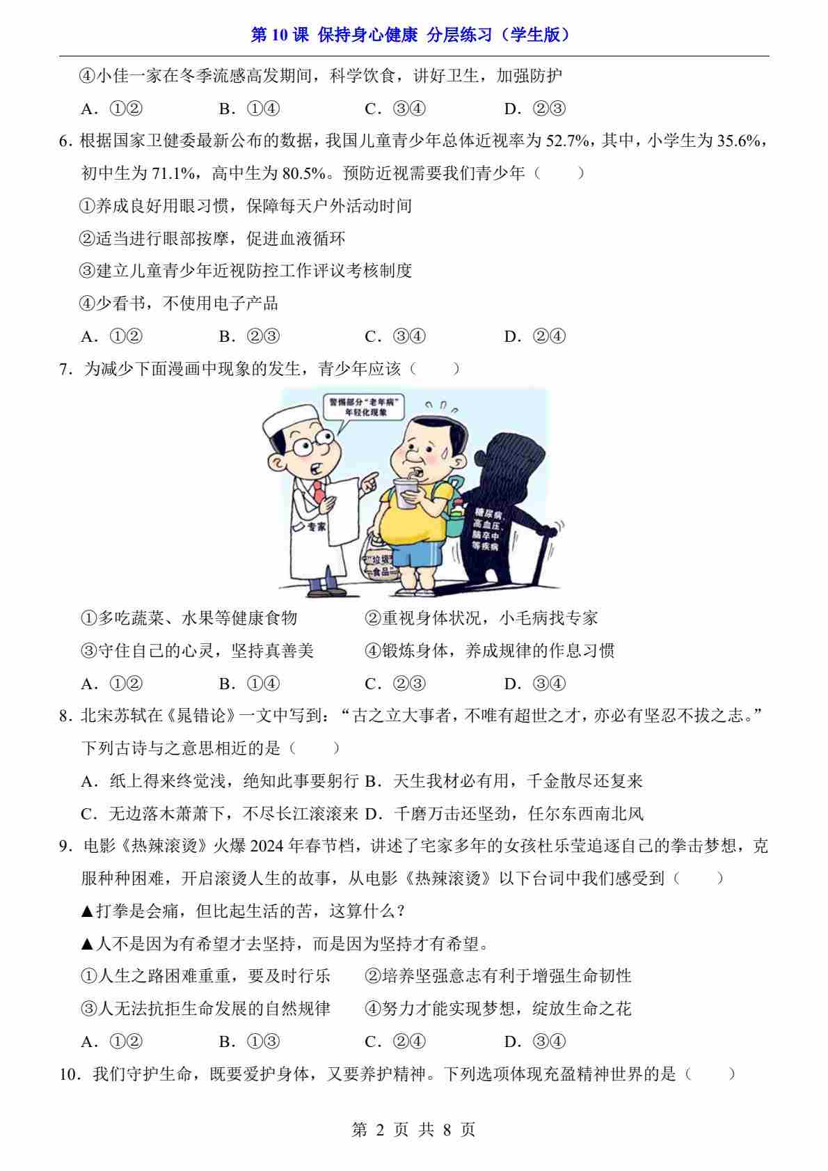 首页 > 全部 > 一课一练 > 第10课 保持身心健康(分层练习)
