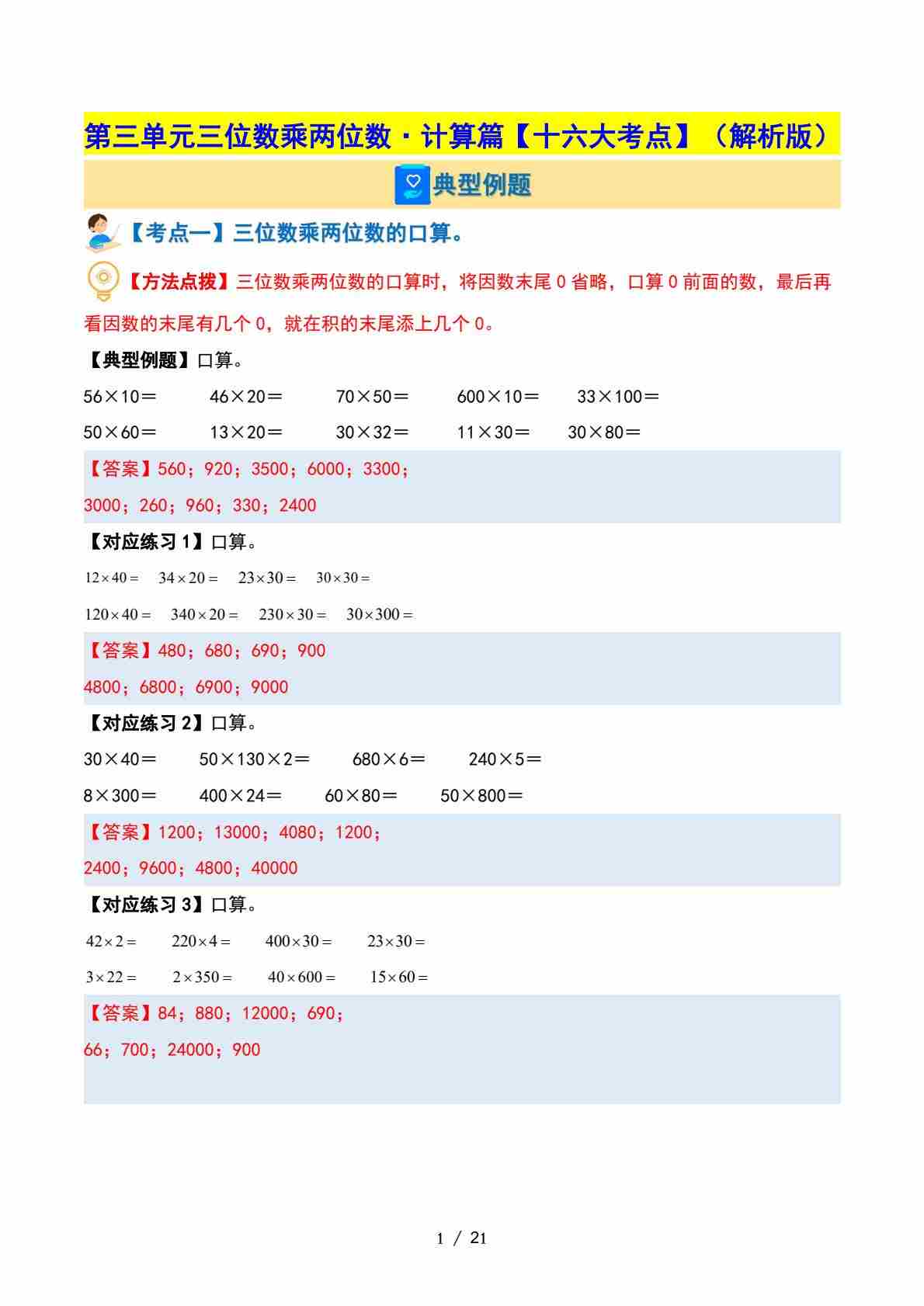 首页 > 全部 > 专项练习 > 四(下)苏教版数学【第三单元三位数乘两位数·计算篇【十六大考点】(解析版)】