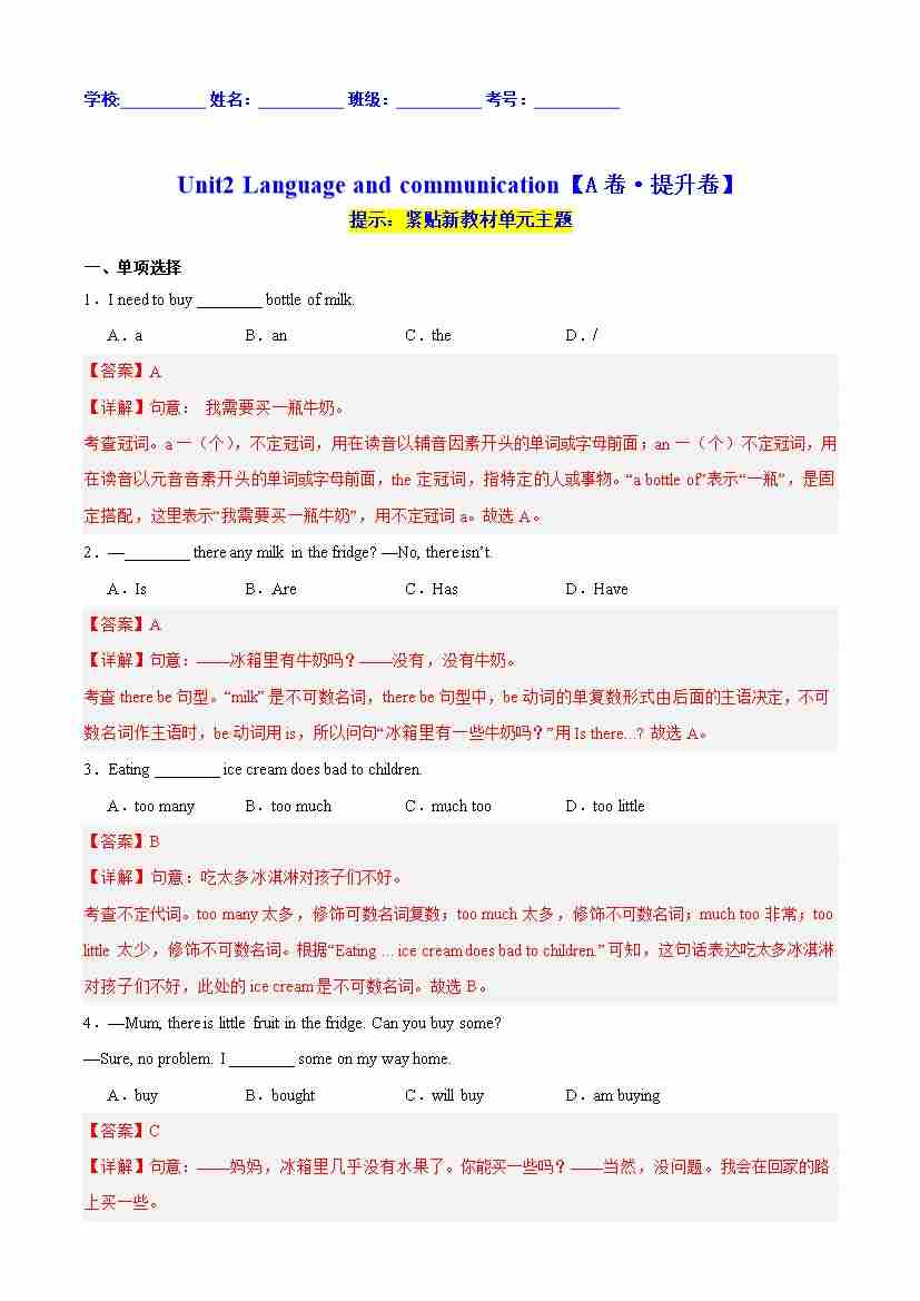 首页 > 全部 > 单元提升卷 > Unit2 Language and communication【A卷·提升卷】(解析版)