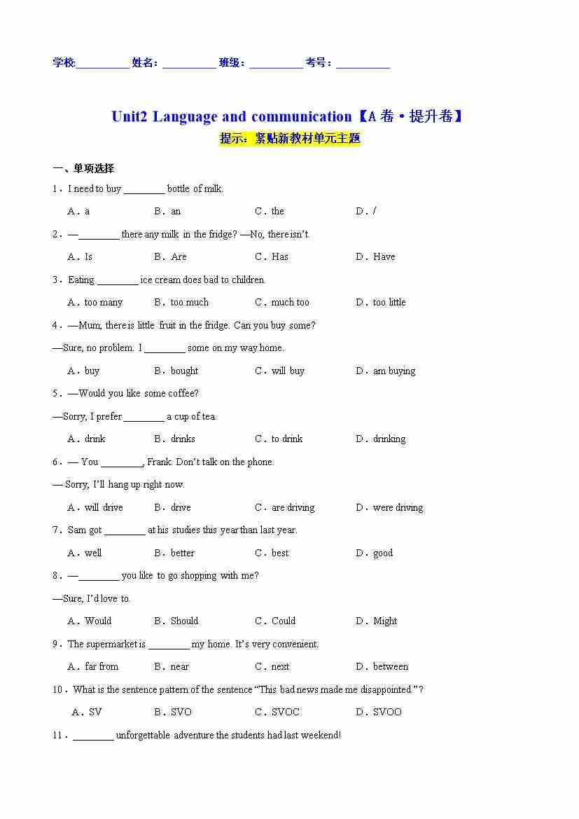 首页 > 全部 > 单元提升卷 > Unit2 Language and communication【A卷·提升卷】(原卷版)