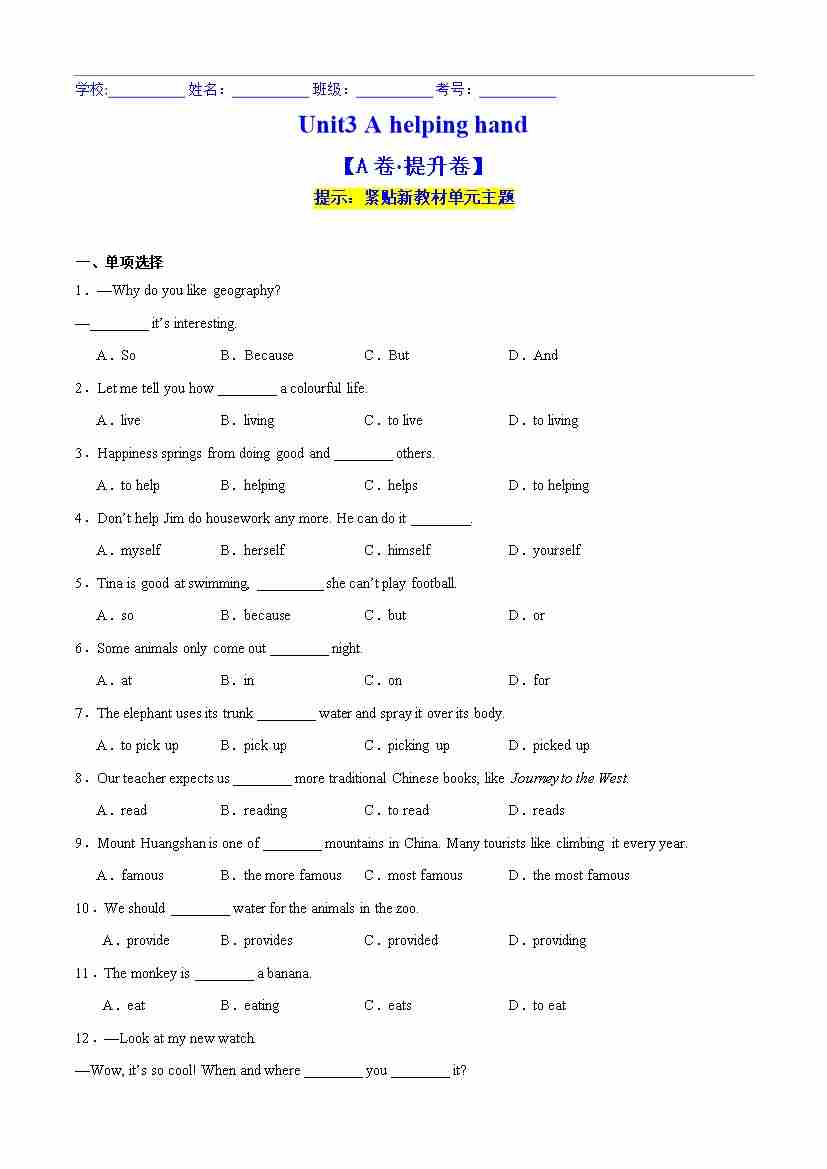 首页 > 全部 > 单元提升卷 > Unit3 A helping hand 【A卷·提升卷】(原卷版)