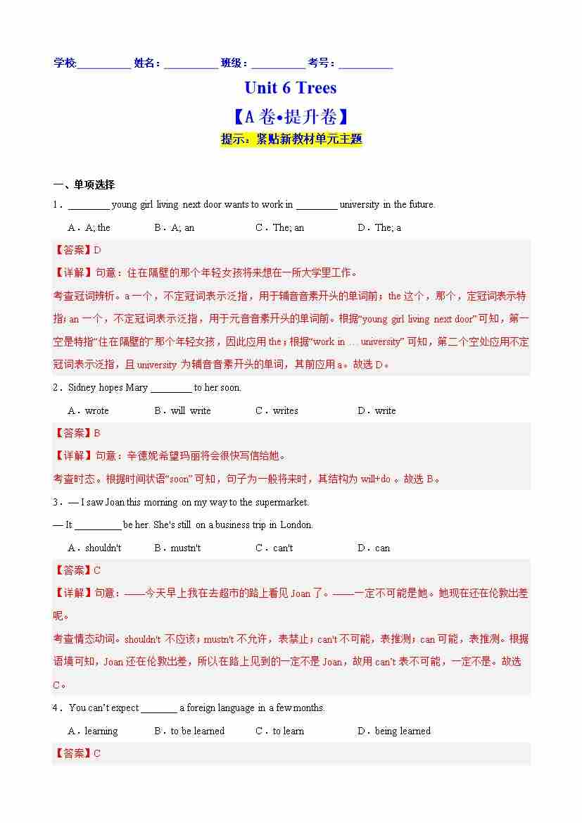 首页 > 全部 > 单元提升卷 > Unit 6 Trees 【A卷·提升卷】(解析版)