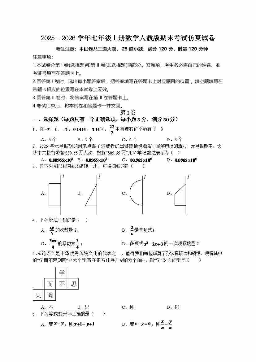 人教版2025—2026学年七年级上册数学期末考试仿真试卷(含答案)