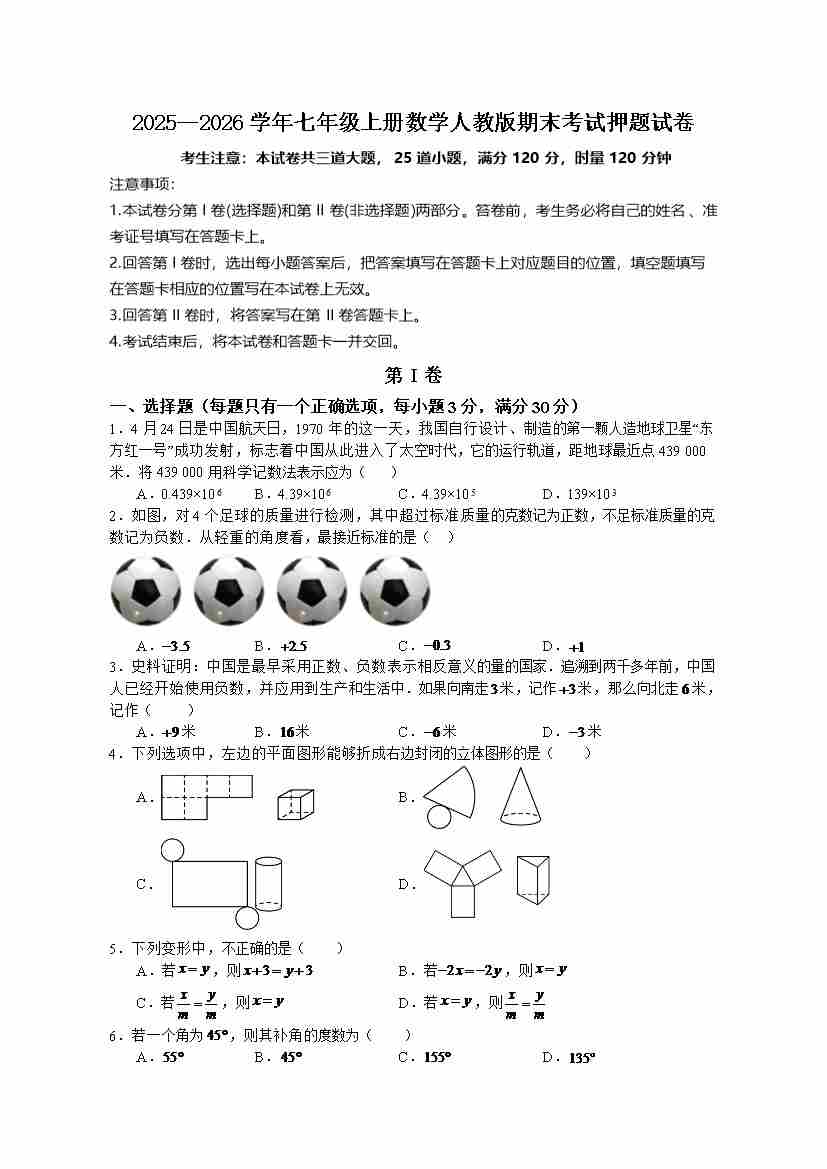 首页 > 全部 > 期末试卷 > 人教版2025—2026学年七年级上册数学期末考试押题试卷(含答案)