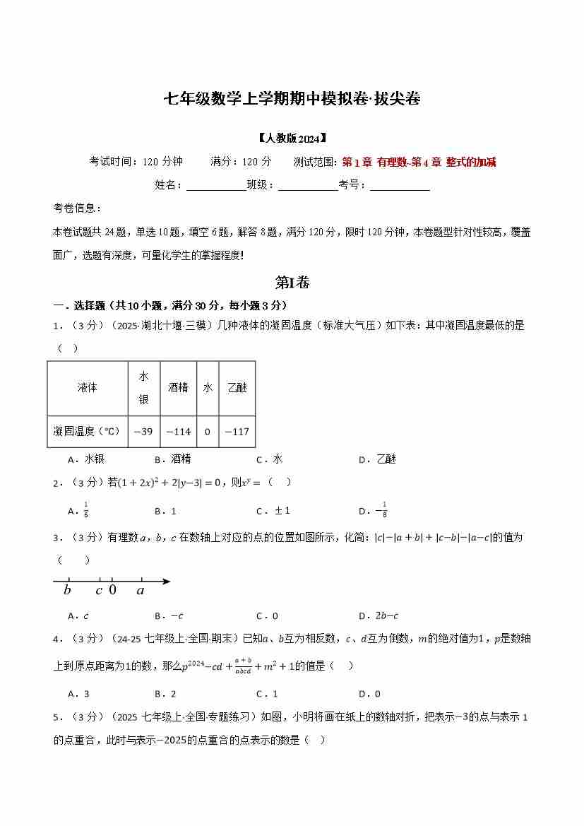 七年级数学上学期期中模拟卷·拔尖卷(人教版2024,举一反三)(学生版)