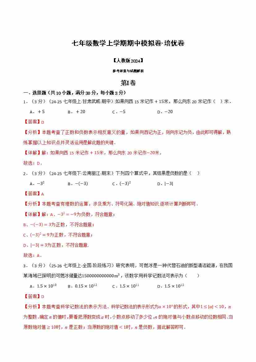 首页 > 全部 > 期中试卷 > 七年级数学上学期期中模拟卷·培优卷(人教版2024,举一反三)(教师版)