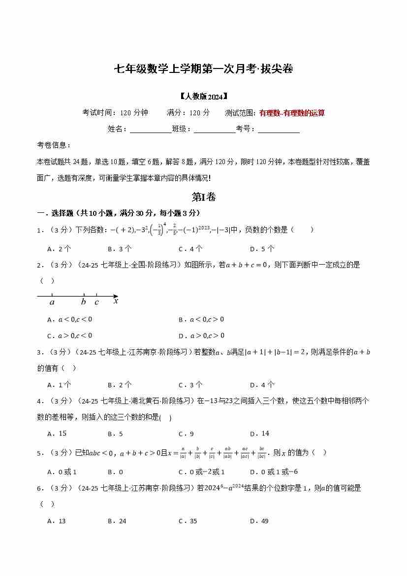 首页 > 全部 > 第一次月考 > 七年级数学上学期第一次月考·拔尖卷(人教版2024,举一反三)(学生版)