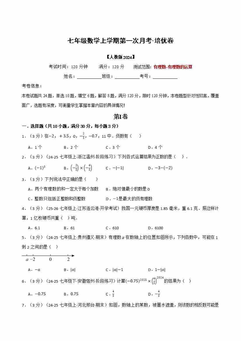 首页 > 全部 > 第一次月考 > 七年级数学上学期第一次月考·培优卷(人教版2024,举一反三)(学生版)