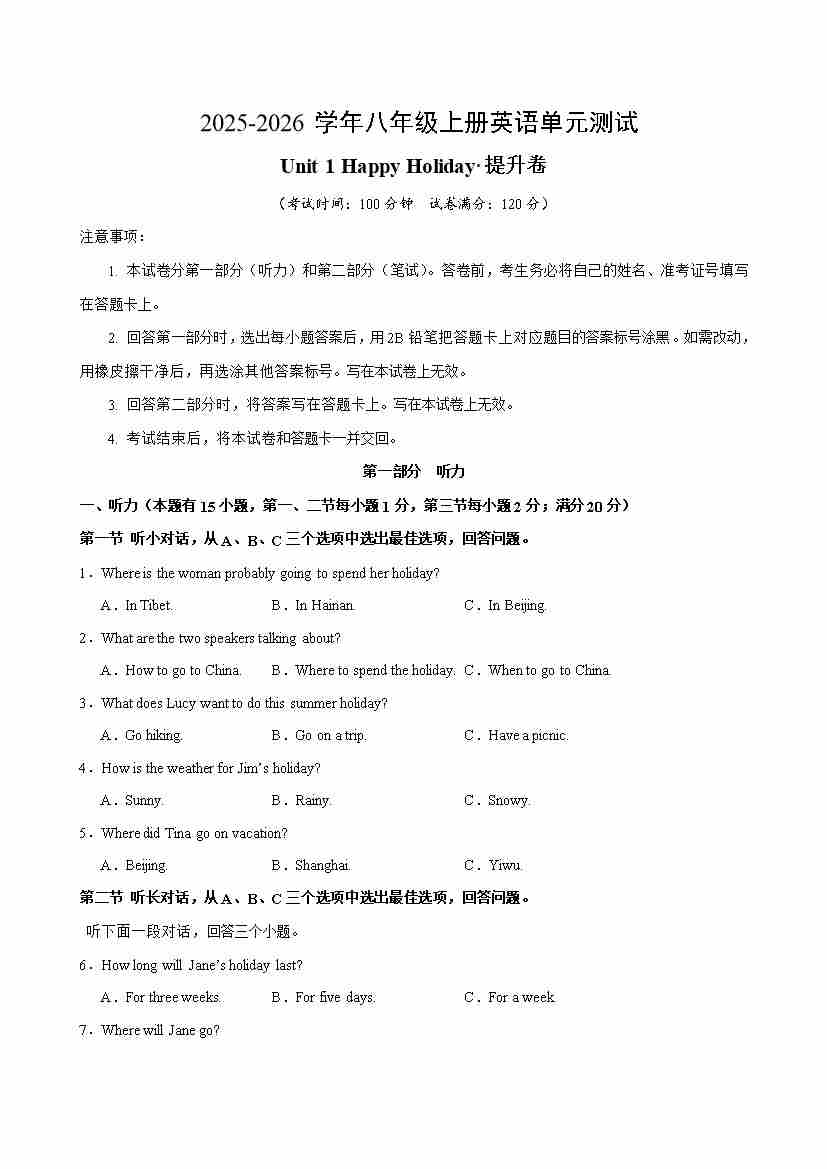 首页 > 全部 > 单元提升卷 > 八年级英语上册Unit 1 单元测试·提升卷(考试版A4)33