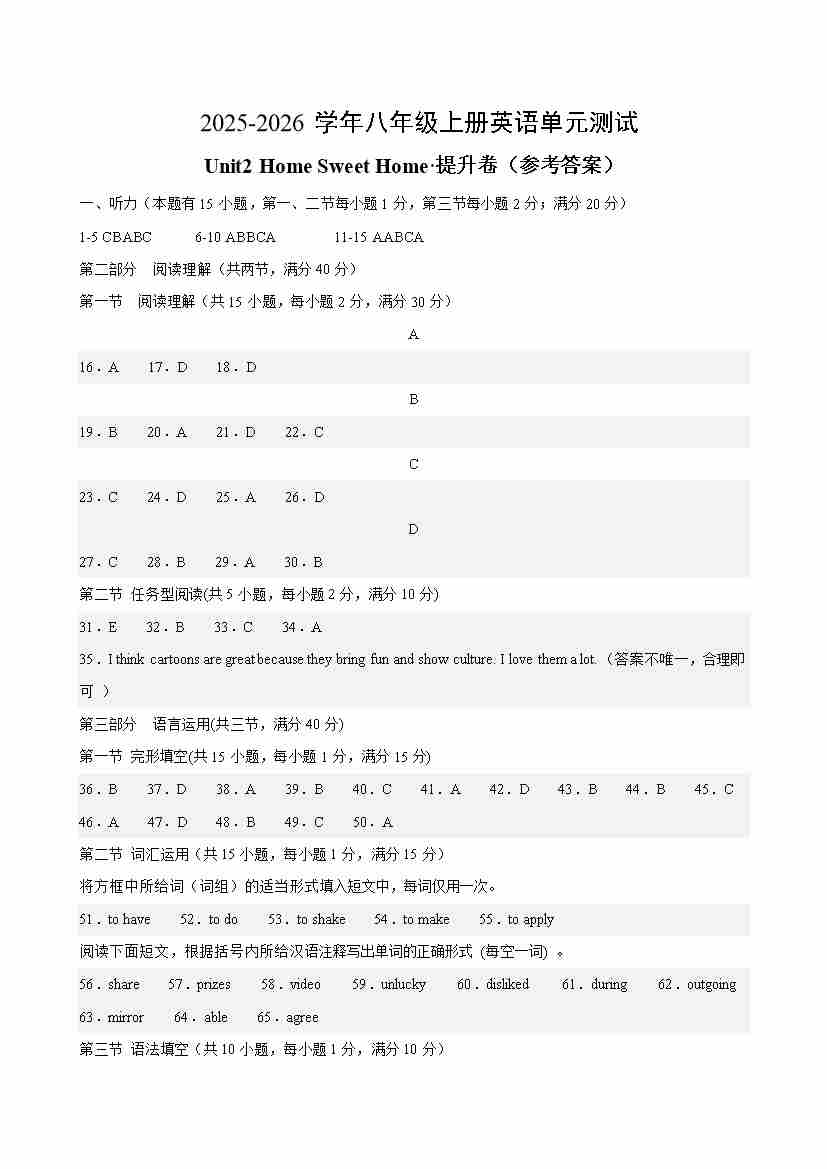 八年级英语上册Unit 2 单元测试·提升卷(参考答案)