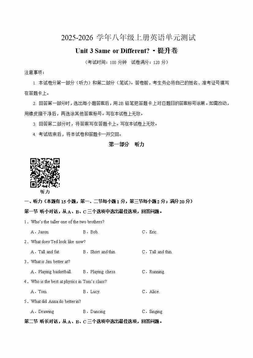 首页 > 全部 > 单元提升卷 > Unit 3 单元测试·提升卷(考试版A4)0