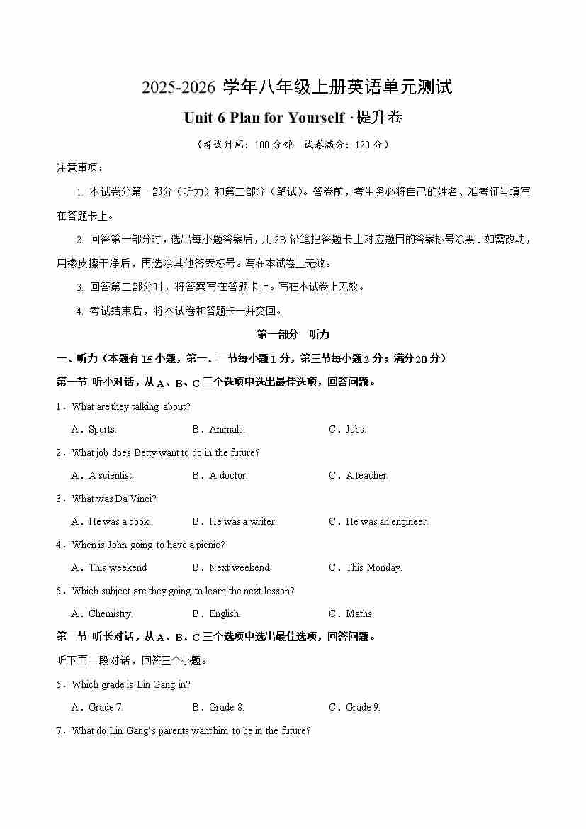 首页 > 全部 > 单元提升卷 > 八年级英语上册Unit 6 单元测试·提升卷(考试版A4)...
