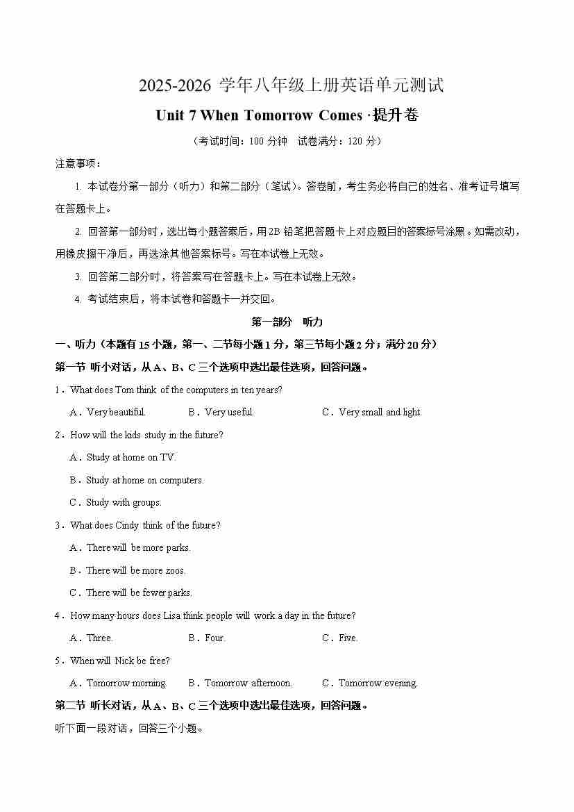 首页 > 全部 > 单元提升卷 > 八年级英语上册Unit 7 单元测试·提升卷(考试版A4)..