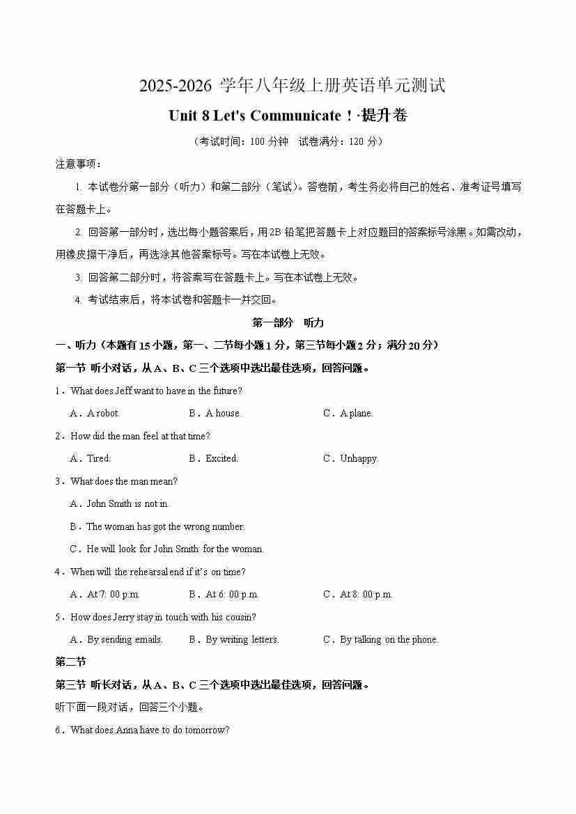 首页 > 全部 > 单元提升卷 > 八年级英语上册Unit 8 单元测试·提升卷(原卷版)..