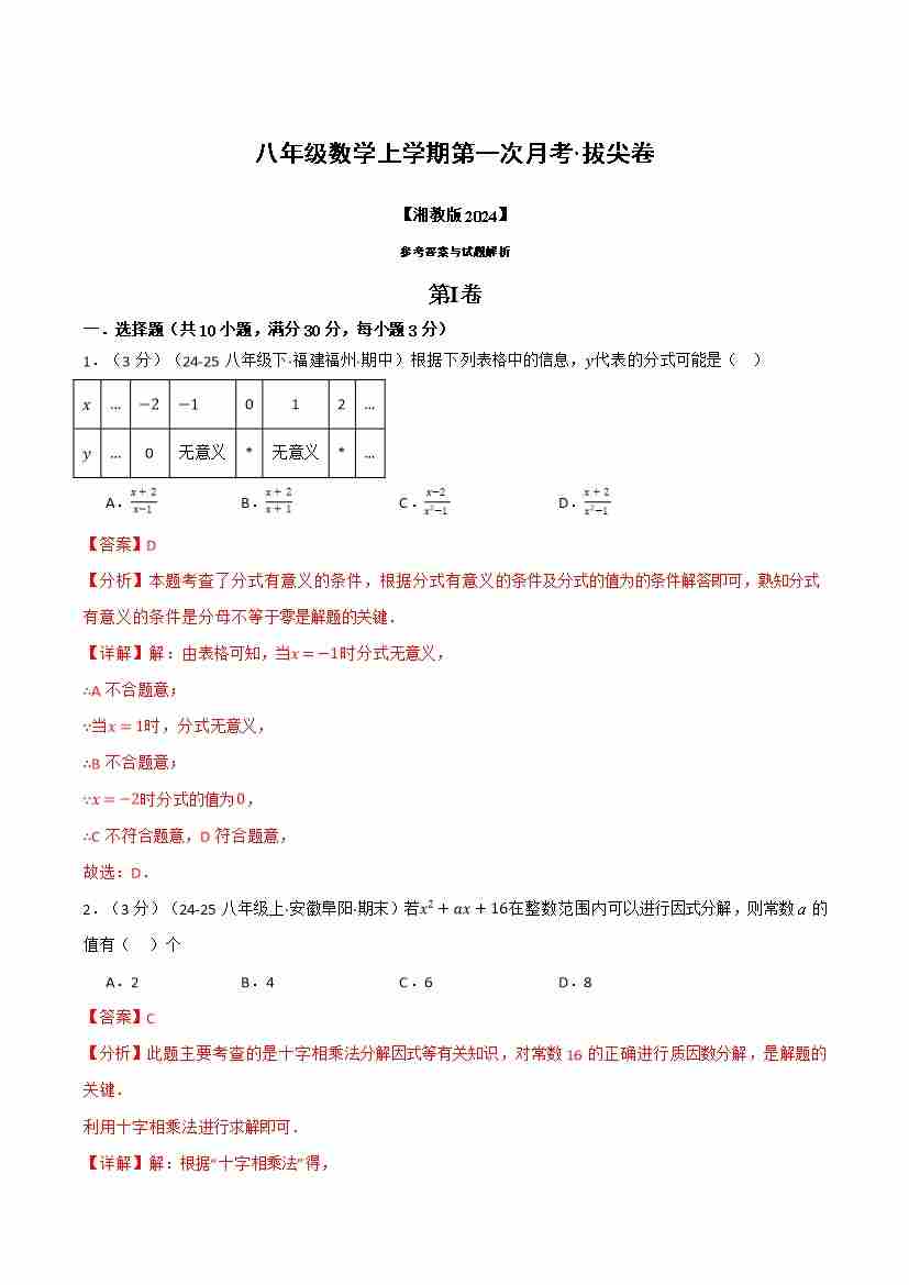 八年级数学上学期第一次月考·拔尖卷(湘教版2024)(解析版)