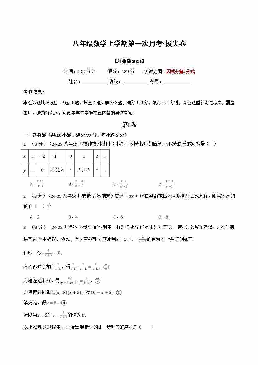 八年级数学上学期第一次月考·拔尖卷(湘教版2024)(原卷版)