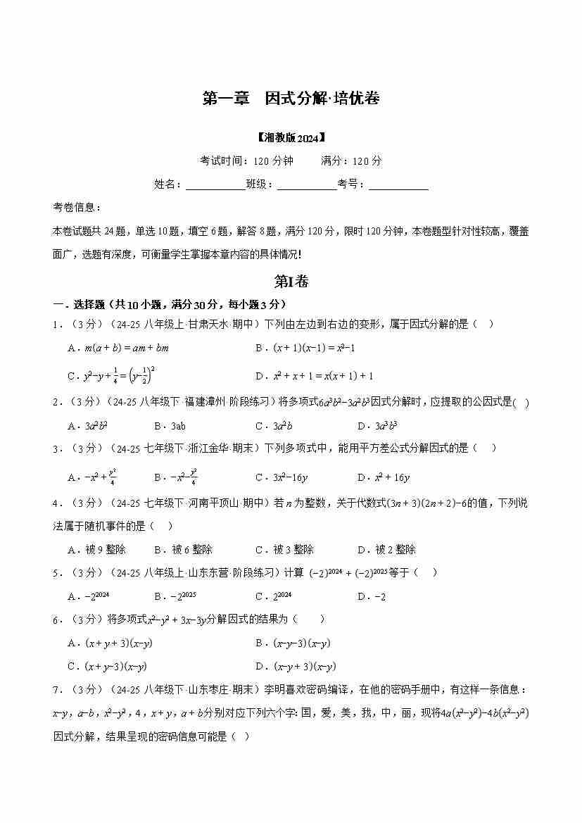 首页 > 全部 > 单元AB卷 > 第1章 因式分解(举一反三单元测试·培优卷)(原卷版)