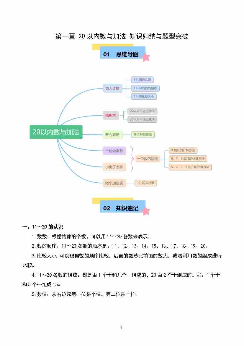 一(下)数学北师大版第一章 20以内数与加法 知识归纳与题型突破(原卷版)-2024-2025学年单元速记·巧练