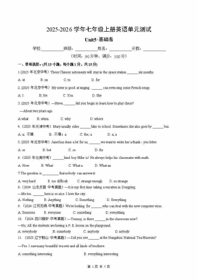 首页 > 全部 > 单元测试 > 七年级英语上册Unit 5 单元测试·基础卷(考试版A4)