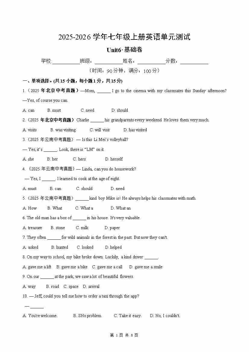 首页 > 全部 > 单元测试 > 七年级英语上册Unit 6 单元测试·基础卷(考试版A4)