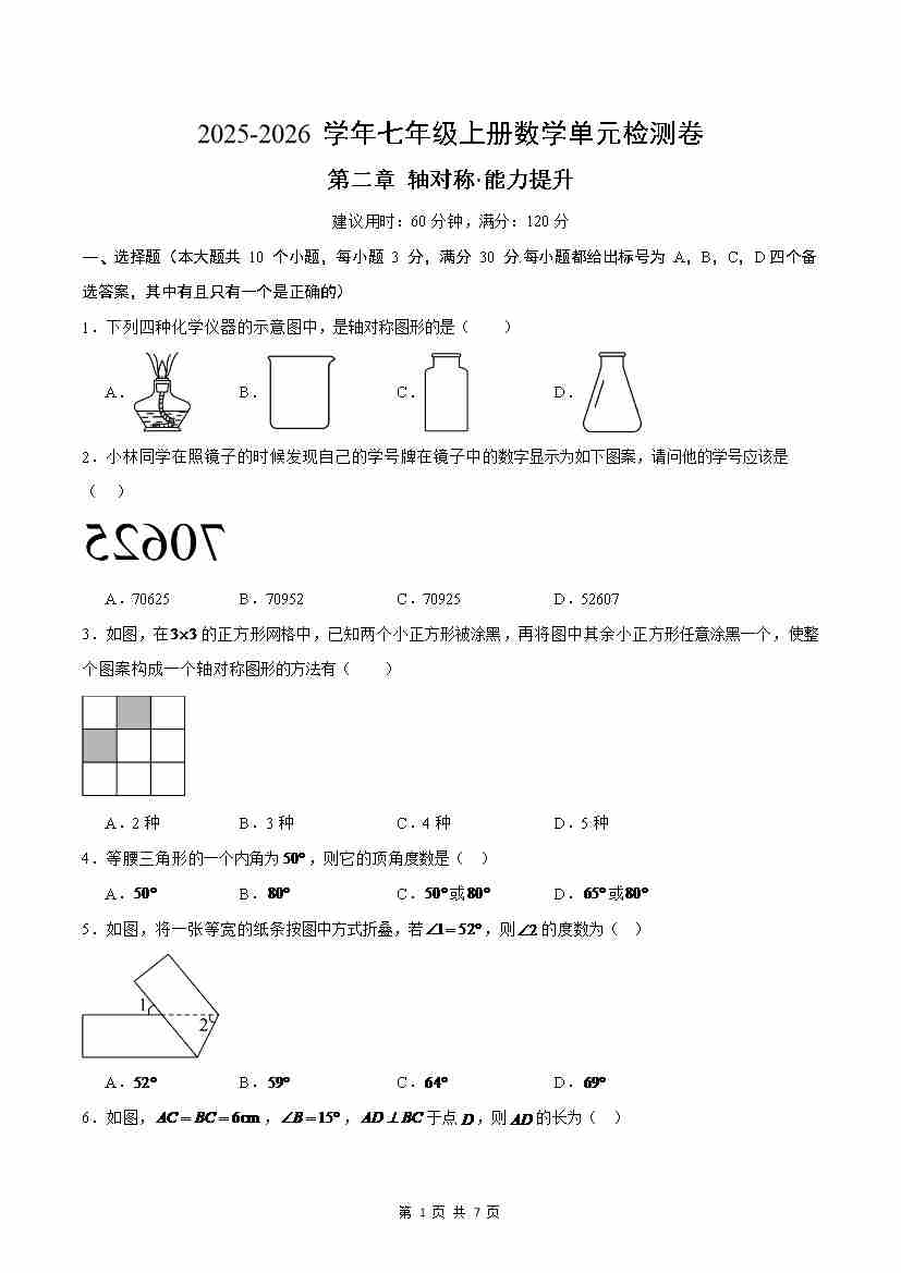 七上数学第2章 轴对称·提升卷(考试版A4)