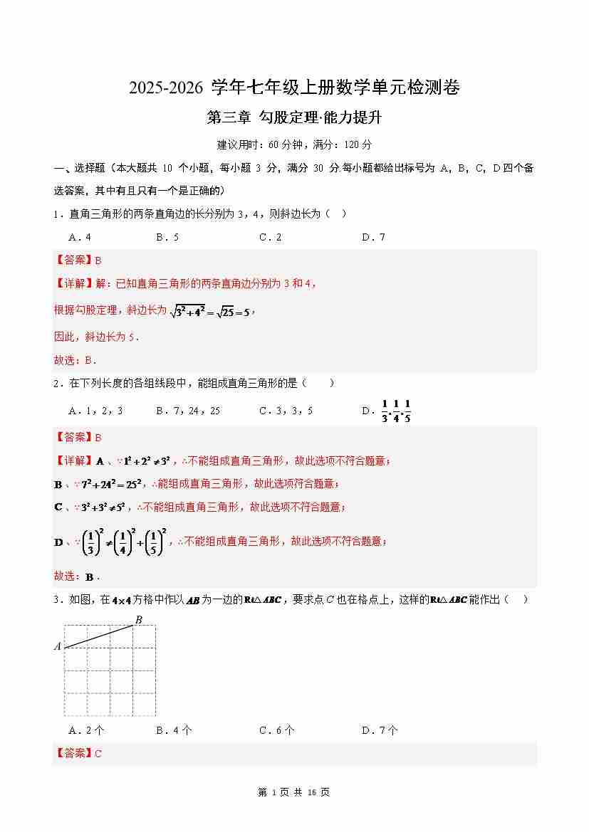 首页 > 全部 > 单元提升卷 > 七上数学第3章 勾股定理测试·提升卷(解析版)