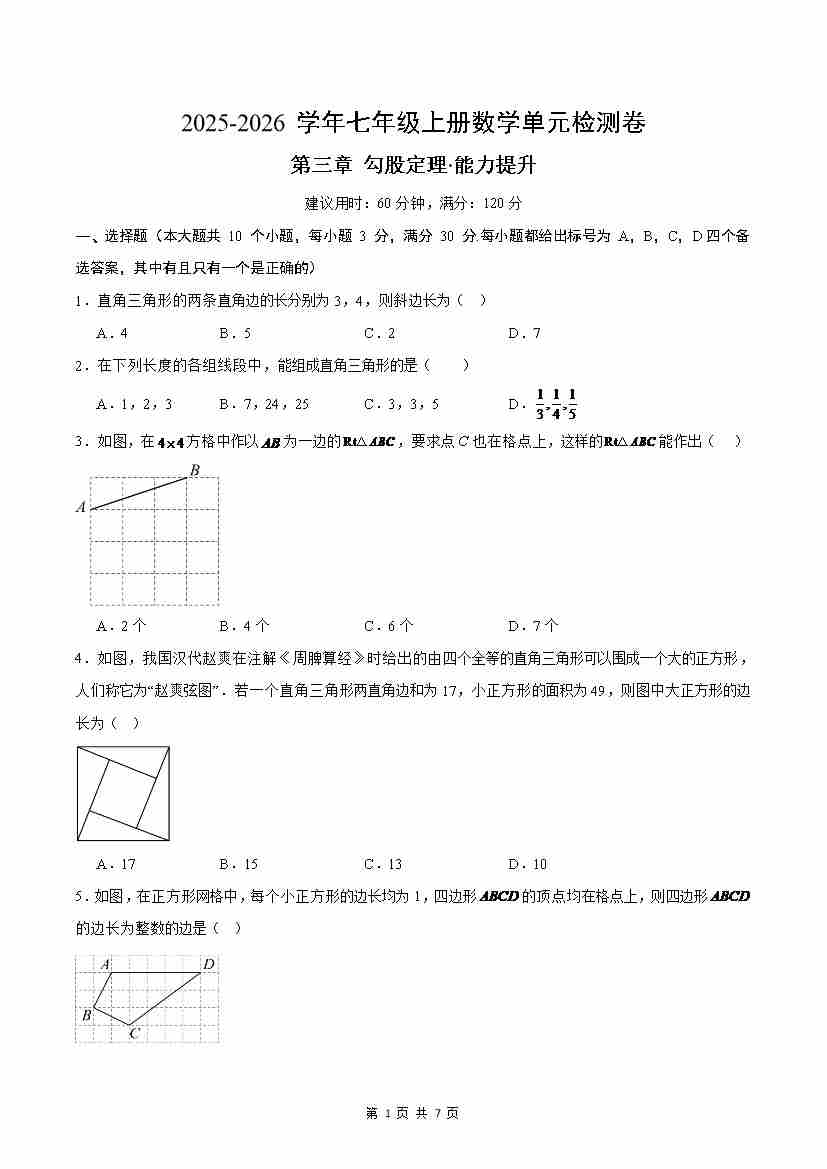 首页 > 全部 > 单元提升卷 > 七上数学第3章勾股定理测试·提升卷(考试版A4)