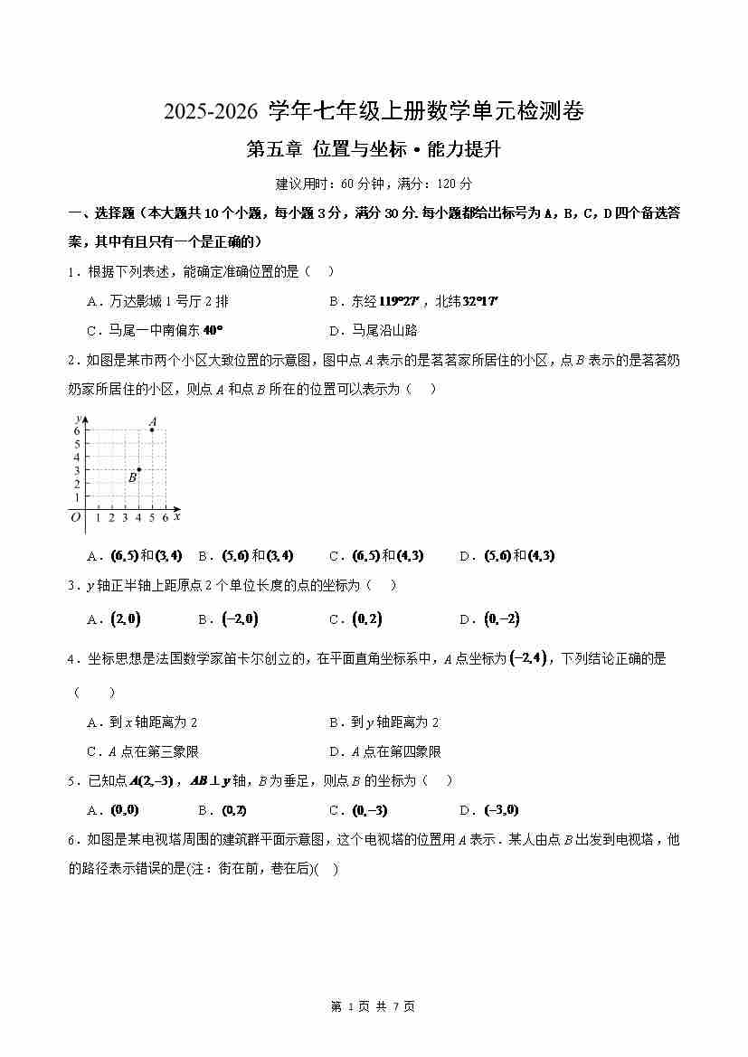 首页 > 全部 > 单元提升卷 > 七上数学第5章 位置与坐标测试·提升卷(考试版A4)