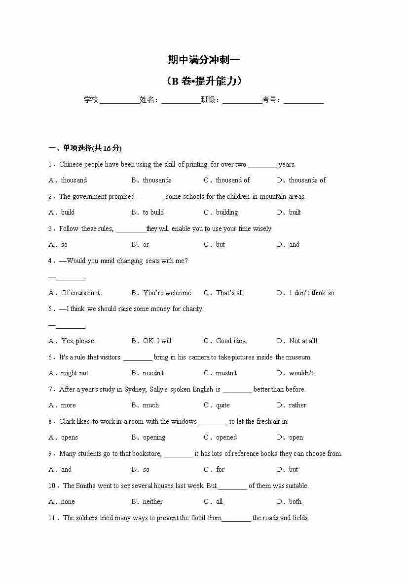 期中满分冲刺一(B卷·能力提升)(原卷版)-九年级上册(牛津上海版)