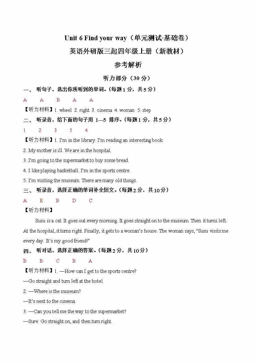 首页 > 全部 > 单元基础卷 > Unit 6 Find your way(参考解析)(单元测试·基础卷)英语外研版三起四年级上册(新教材)