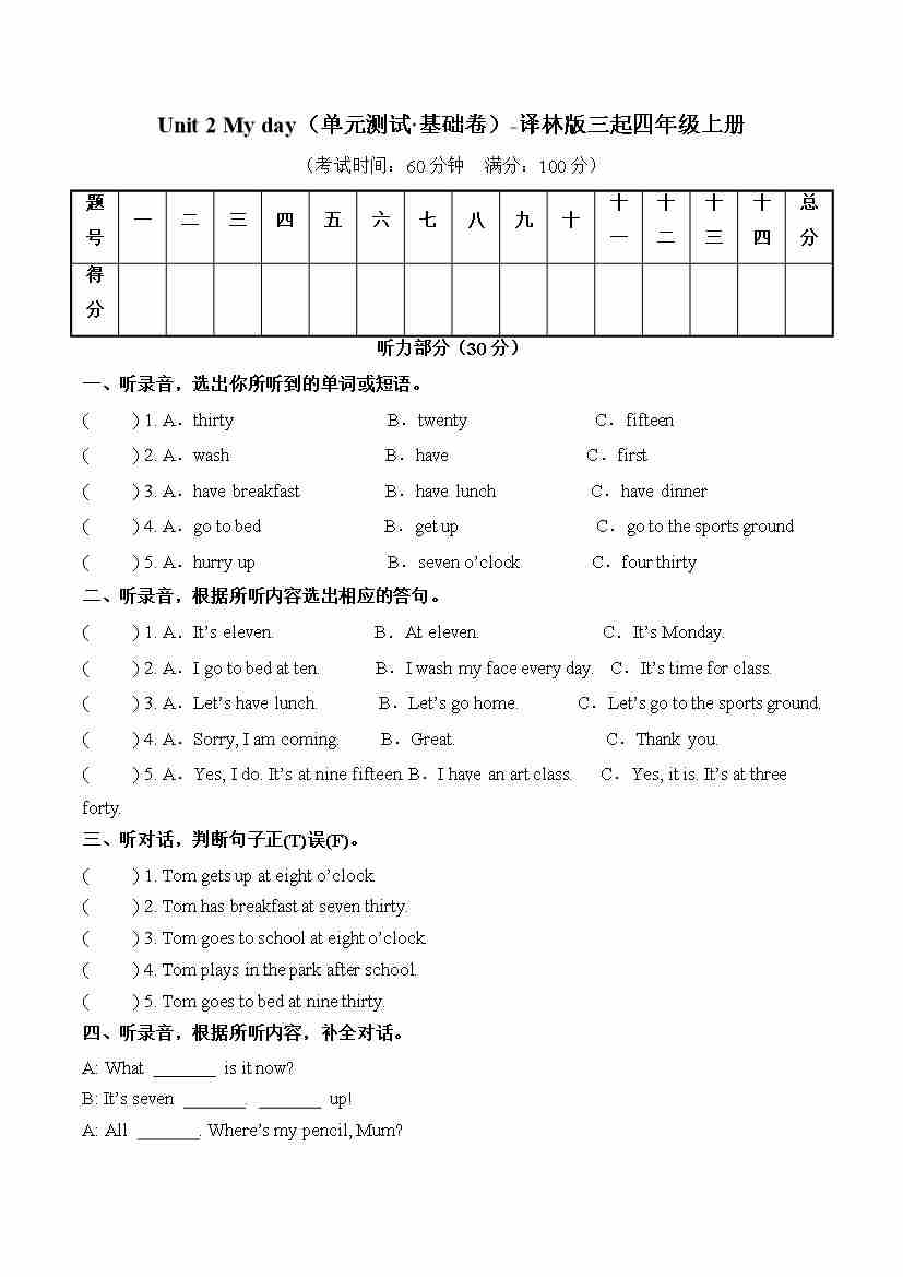 首页 > 全部 > 单元基础卷 > Unit 2 My day(单元测试·基础卷)译林版三起 四年级上册(新教材)