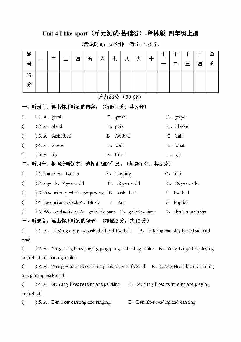 Unit 4 I like sport(单元测试·基础卷)英语译林版三起四年级上册(新教材)
