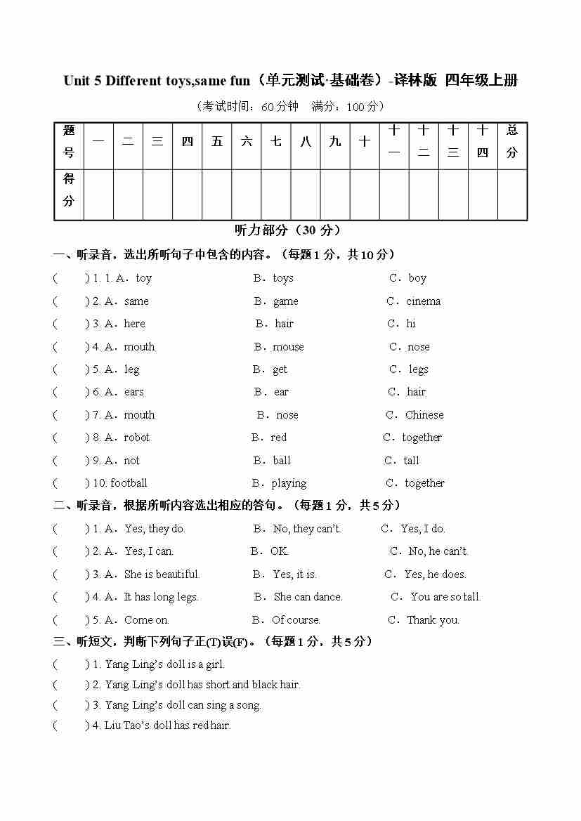 首页 > 全部 > 单元基础卷 > Unit 5 Different toys,same fun (单元测试·基础卷)英语译林版三起四年级上册(新教材)