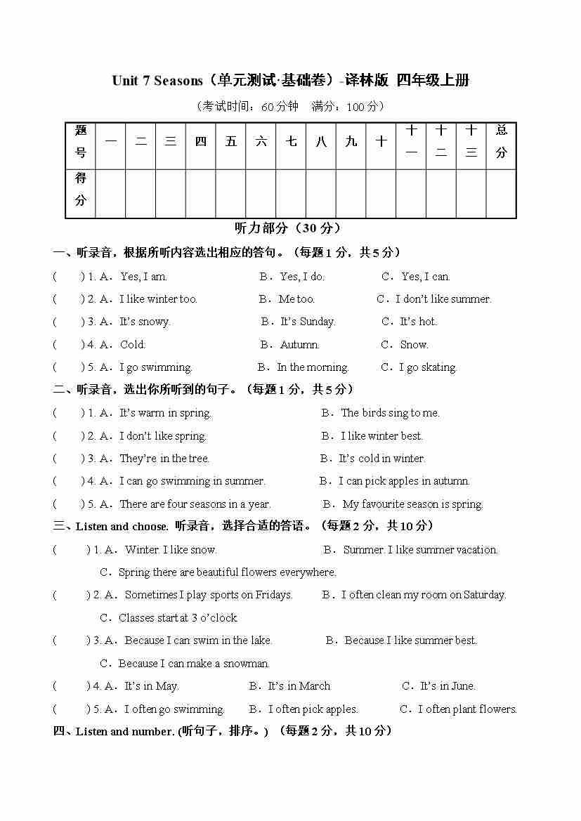 Unit 7 Seasons(单元测试·基础卷)译林版四年级上册(新教材)