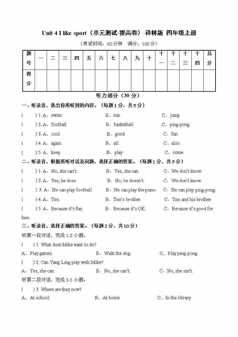 Unit 4 I like sport(单元测试·提高卷)英语译林版三起四年级上册(新教材)111