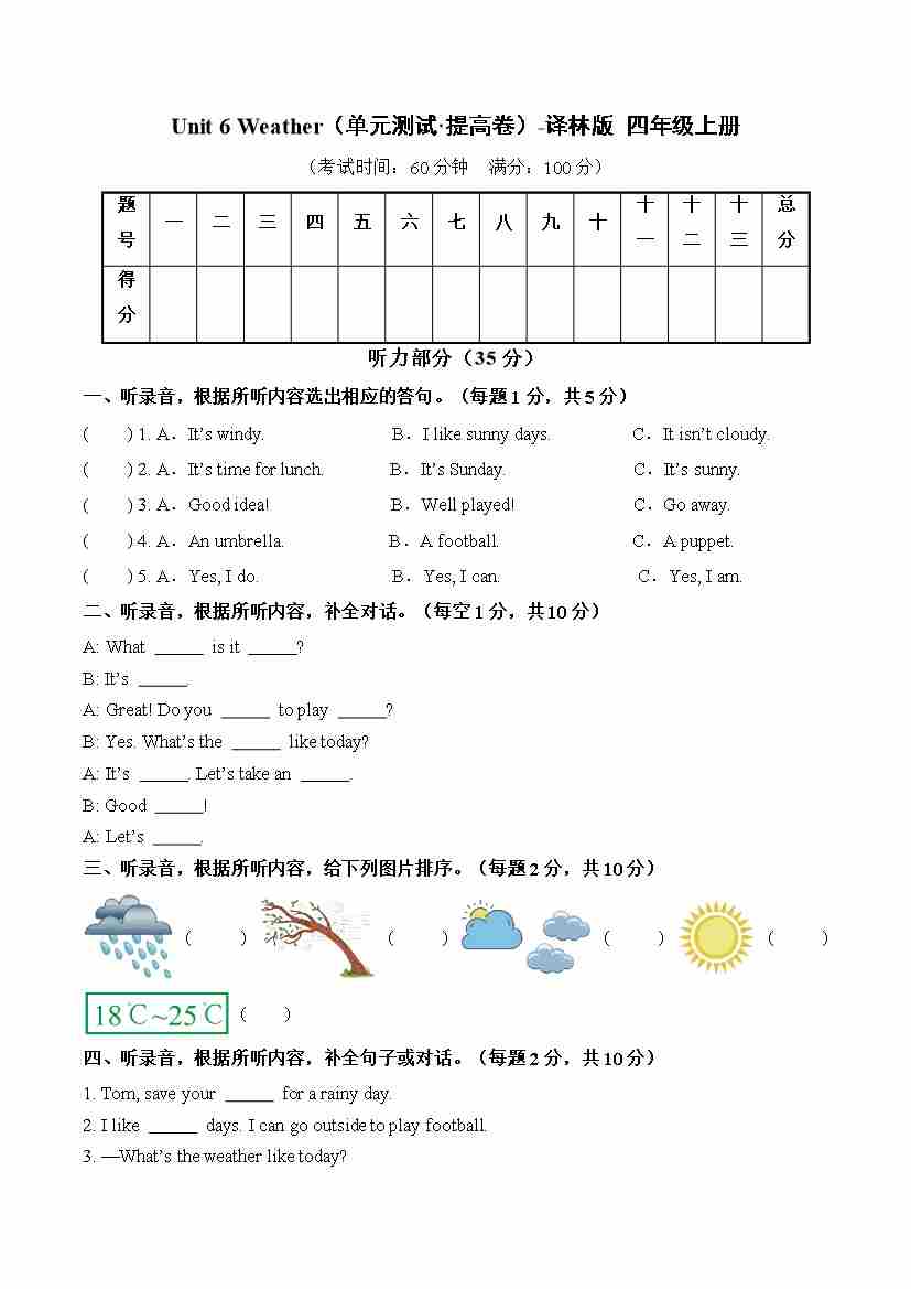 首页 > 全部 > 单元提升卷 > Unit 6 Weather(单元测试·提高卷)译林版四年级上册(新教材)333