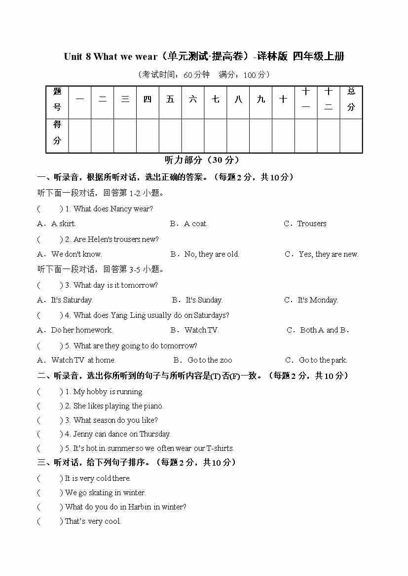 首页 > 全部 > 单元提升卷 > Unit 8 What we wear(单元测试·提高卷)译林版四年级上册(新教材)00