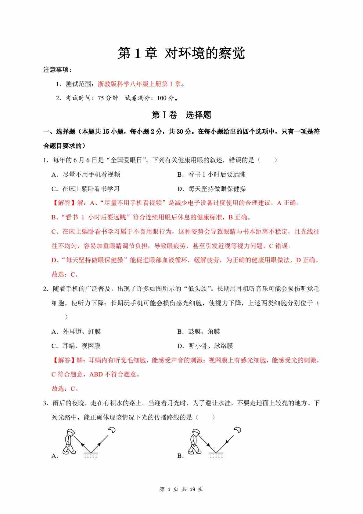 首页 > 全部 > 单元测试 > 第1章 对环境的察觉(高效培优·单元测试)(解析版)