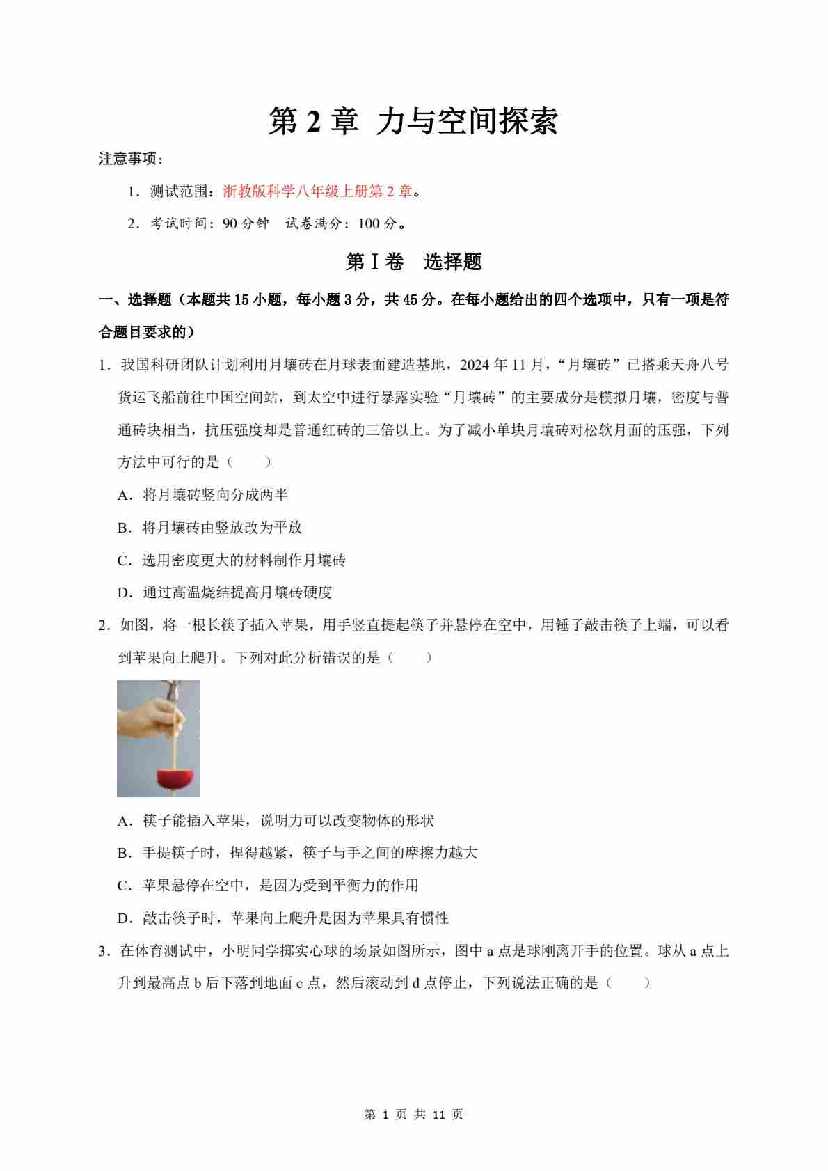 第2章 力与空间探索(高效培优·单元测试)(原卷版)