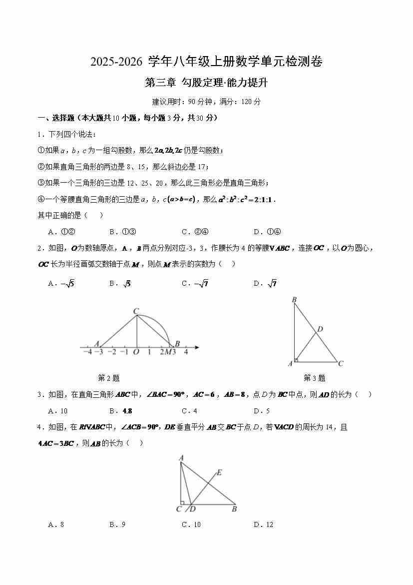 首页 > 全部 > 单元提升卷 > 第3章 勾股定理测试·提升卷(考试版A4)