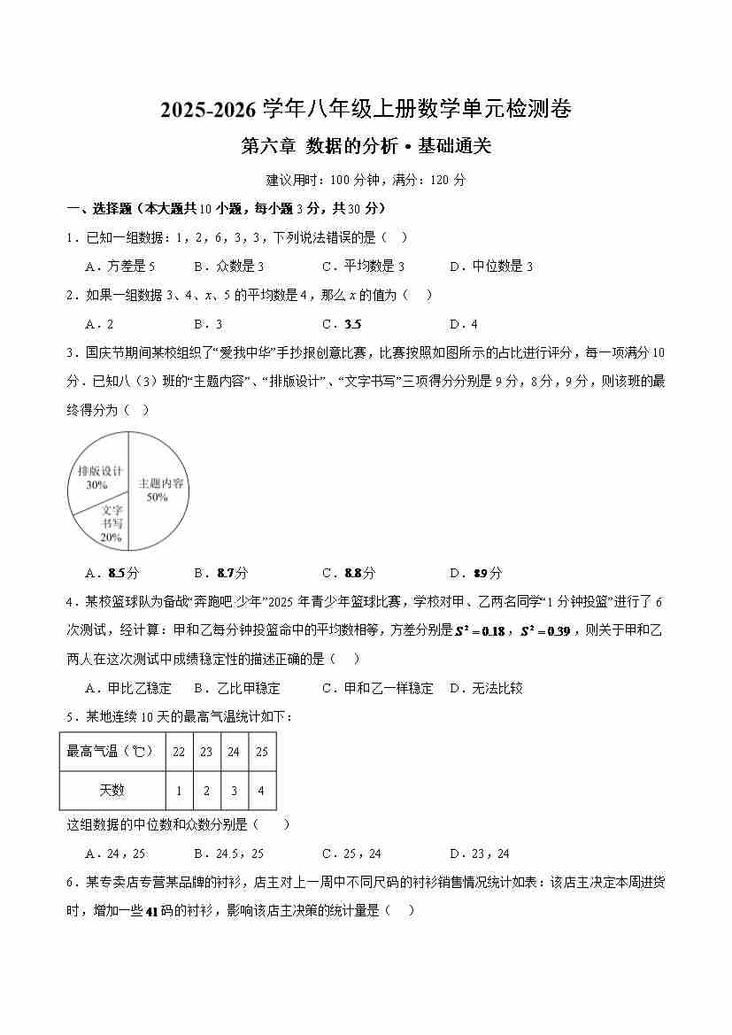 八上数学第六章 数据的分析测试·基础卷(考试版A4)