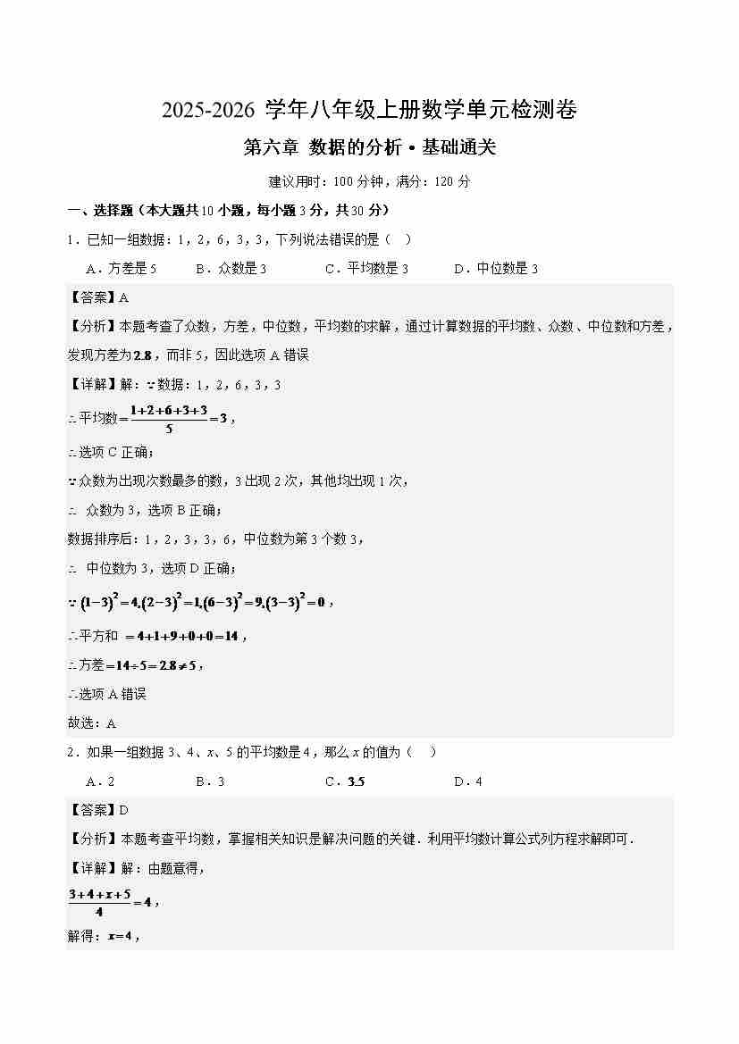 首页 > 全部 > 单元基础卷 > 八上数学第六章 数据的分析测试·基础卷(解析版)
