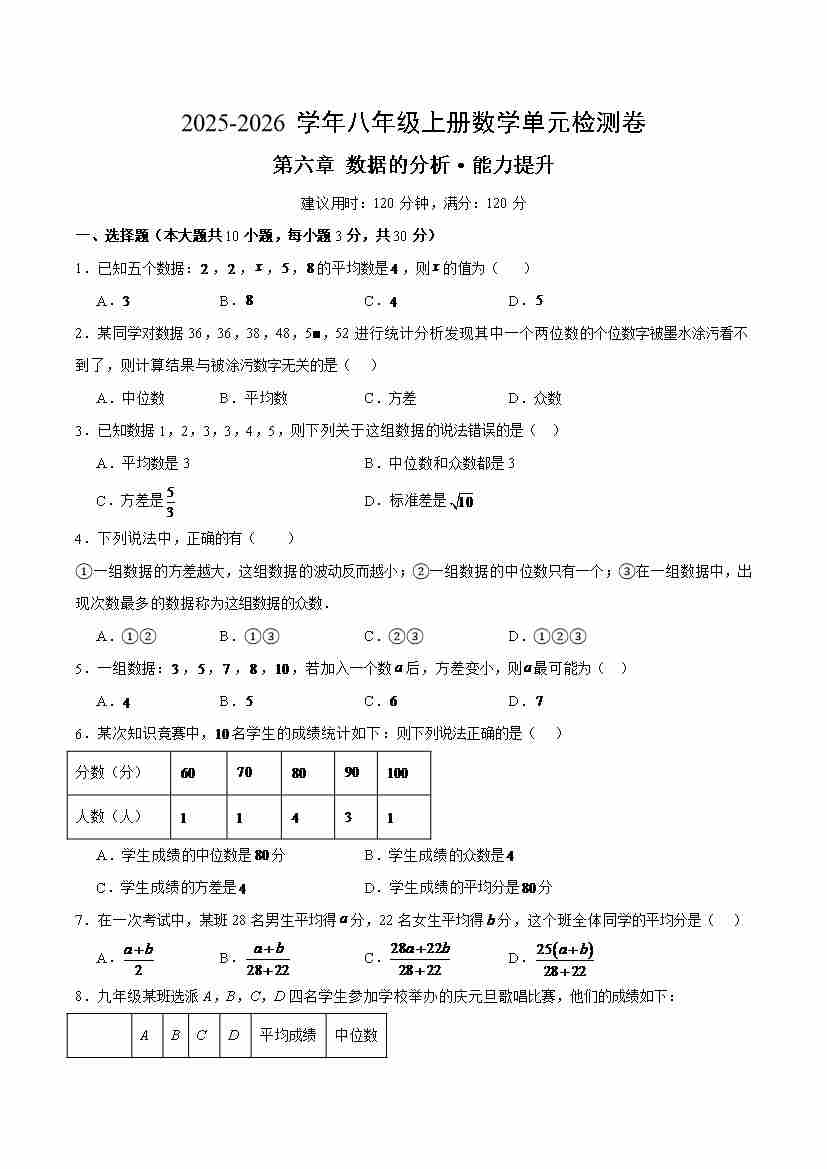 八上数学第六章 数据的分析测试·提升卷(考试版A4)