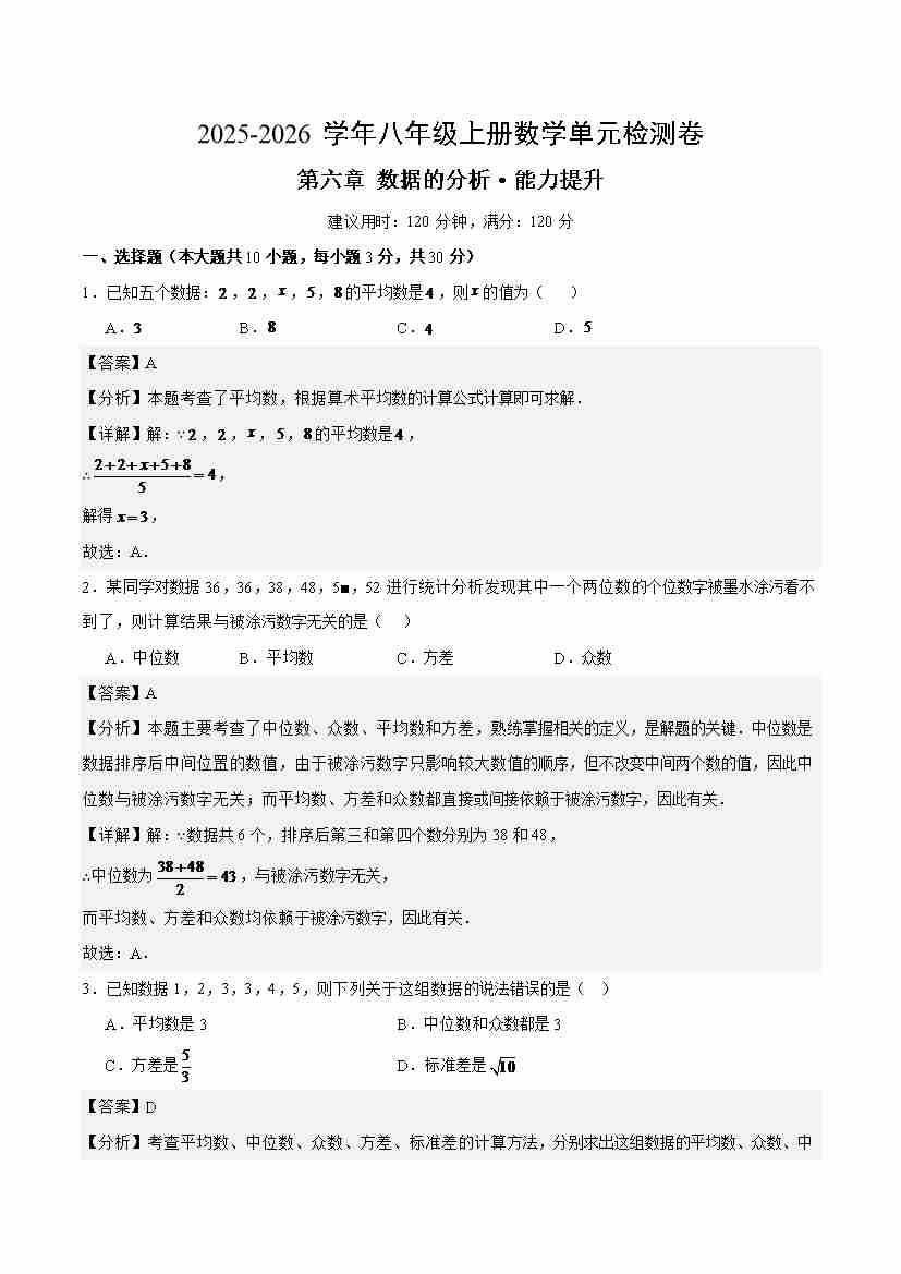 首页 > 全部 > 单元提升卷 > 八上数学第六章 数据的分析测试·提升卷(解析版)