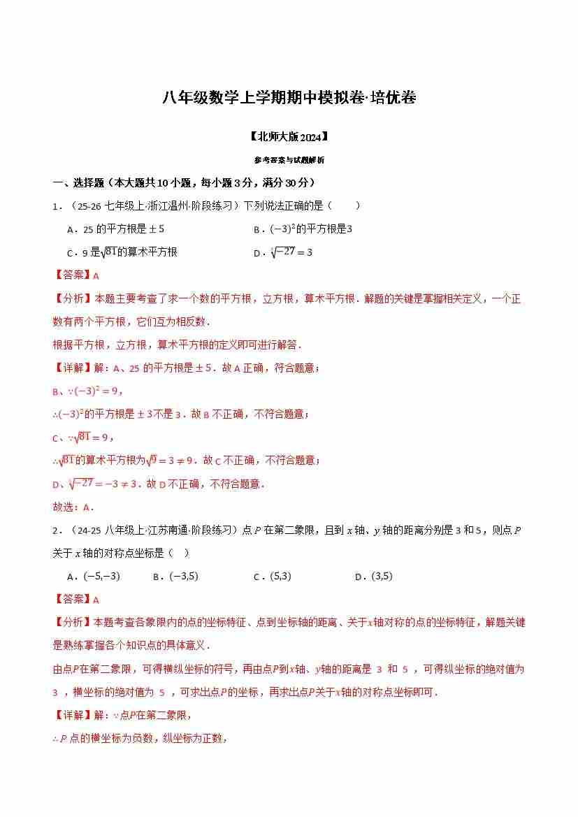 首页 > 全部 > 期中试卷 > 八年级数学上学期期中模拟卷·培优卷(北师大版2024,举一反三)(教师版)